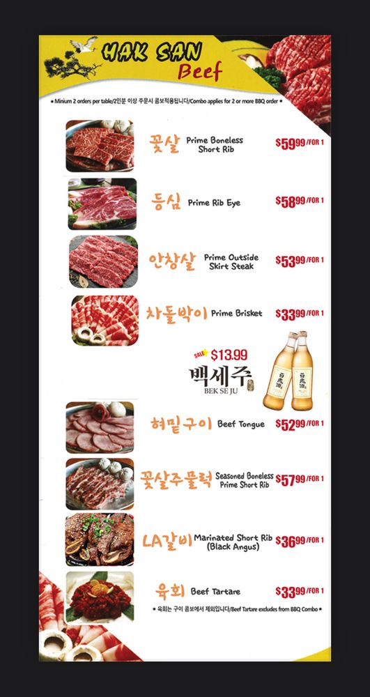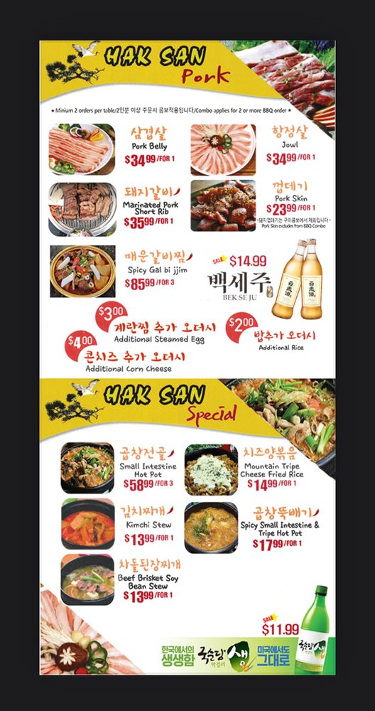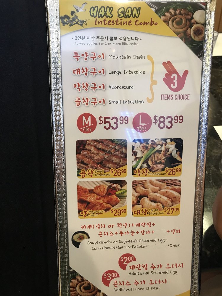 Hak San - Torrance offers a unique dining experience specializing in intestine dishes. Located in Torrance, CA, the restaurant is known for its intestine combo options such as Abomasum and Mountain Chain. The menu also includes flavorful soups like Kimchi Stew and Spicy Intestine Soup. Customers praise the restaurant for its delicious gopchang and makchang, as well as their attentive and friendly service. The ambiance is described as intimate and lowkey, perfect for a relaxing meal. If you're feeling adventurous, try the large intestine for a truly authentic Korean barbecue experience. With excellent food and top-notch service, Hak San - Torrance is a must-visit for intestine lovers in the South Bay area.